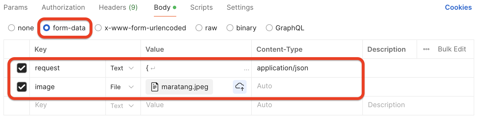 이미지 파일은 @RequestParam 부분의 value로 들어갔던 값을 Key 부분에 넣어주고 Value 부분에 파일을 첨부하면 된다.