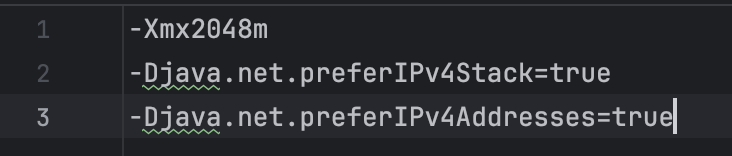 - Djava.net.preferIpv4Stack = true : 자바 애플리케이션이 네트워크 통신을 할 때, 기본적으로는 IPv6 스택(프로토콜)을 사용하려고 한다. 이 속성은 JVM이 IPv4 스택을 우선 사용하도록 강제한다.