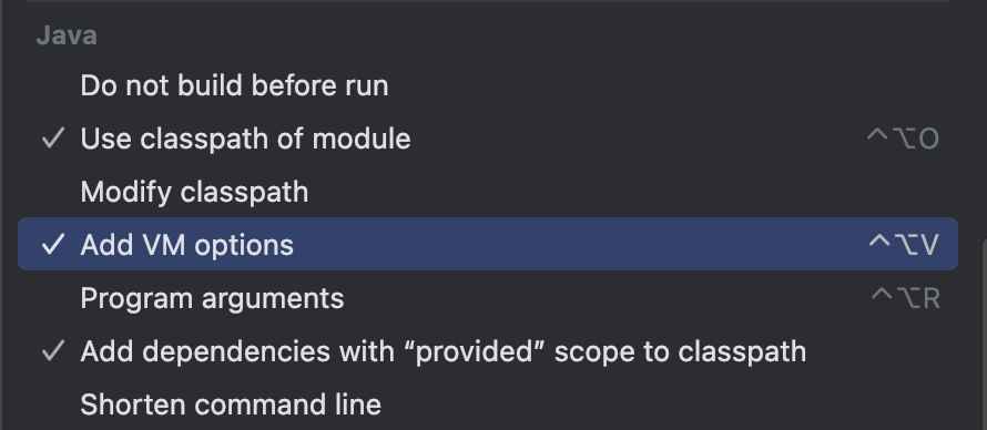 Application > EditConfiguration > Modify options > Add VM options