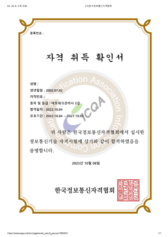전공 관련 다른 자격증을 취득하기에는 조건이 안 맞아서 못하고 딸 수 있는 자격증이 네관사랑 리눅스마스터 뿐이어서 일단 두 개 먼저 땄다.