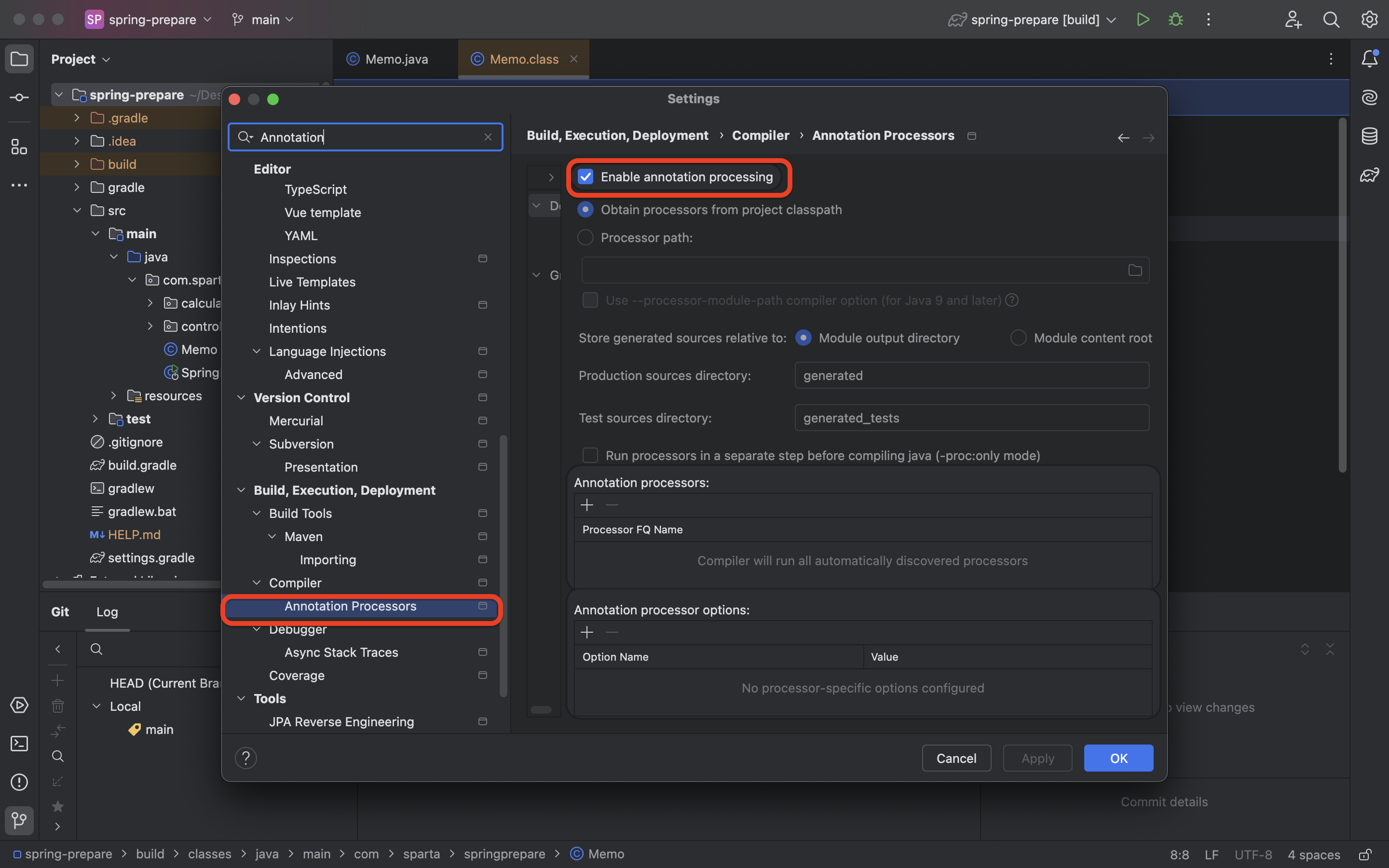 Settings → 'Annotation'검색 → Enable annotation processing 활성화 → Apply 후 OK