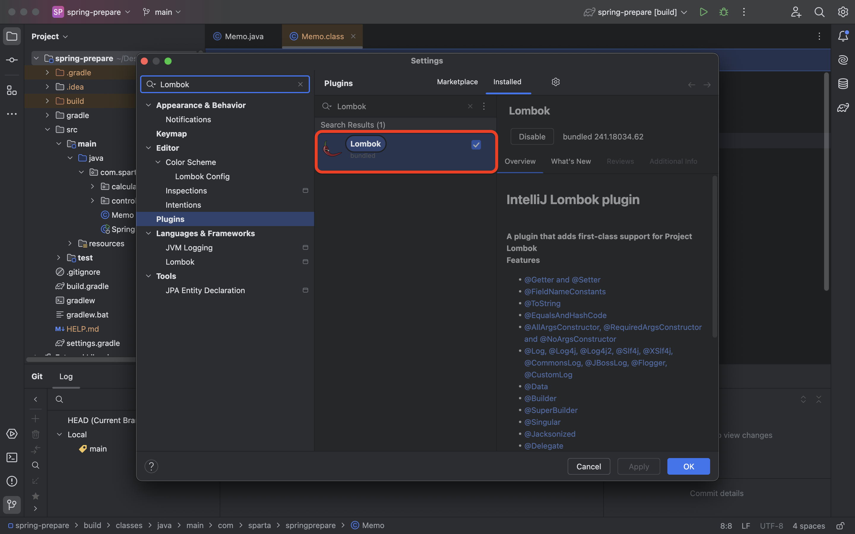Settings → 'Lombok'검색 → Enable로 되어있으면 눌러서 활성화 → Apply 후 OK