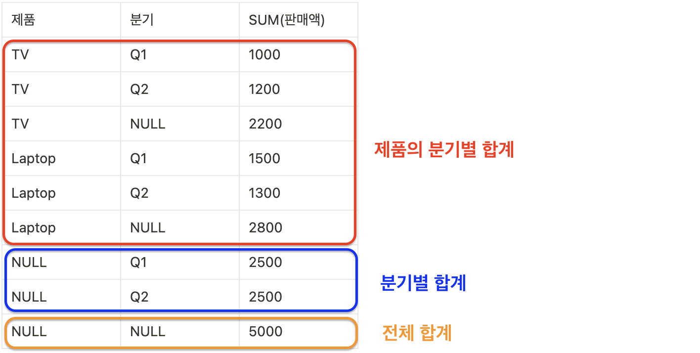 GROUP BY ROLLUP(제품, 분기); -- 제품, 분기, 전체에 대한 합계를 계산
