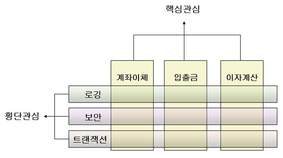 관점을 기준으로 묶어 개발하는 방식을 의미한다. 여기서 관점(aspect)란 어떤 기능을 구현할 때 그 기능을 '핵심기능'과 '부가기능'으로 구분해 각각을 하나의 관점으로 보는 것이다.